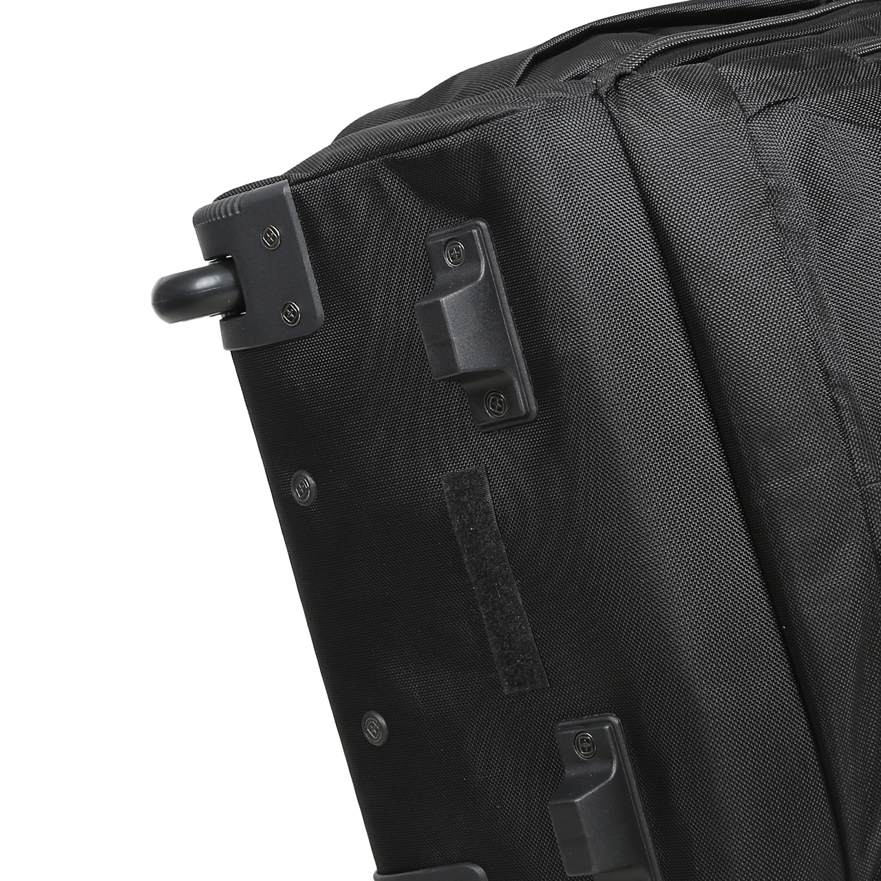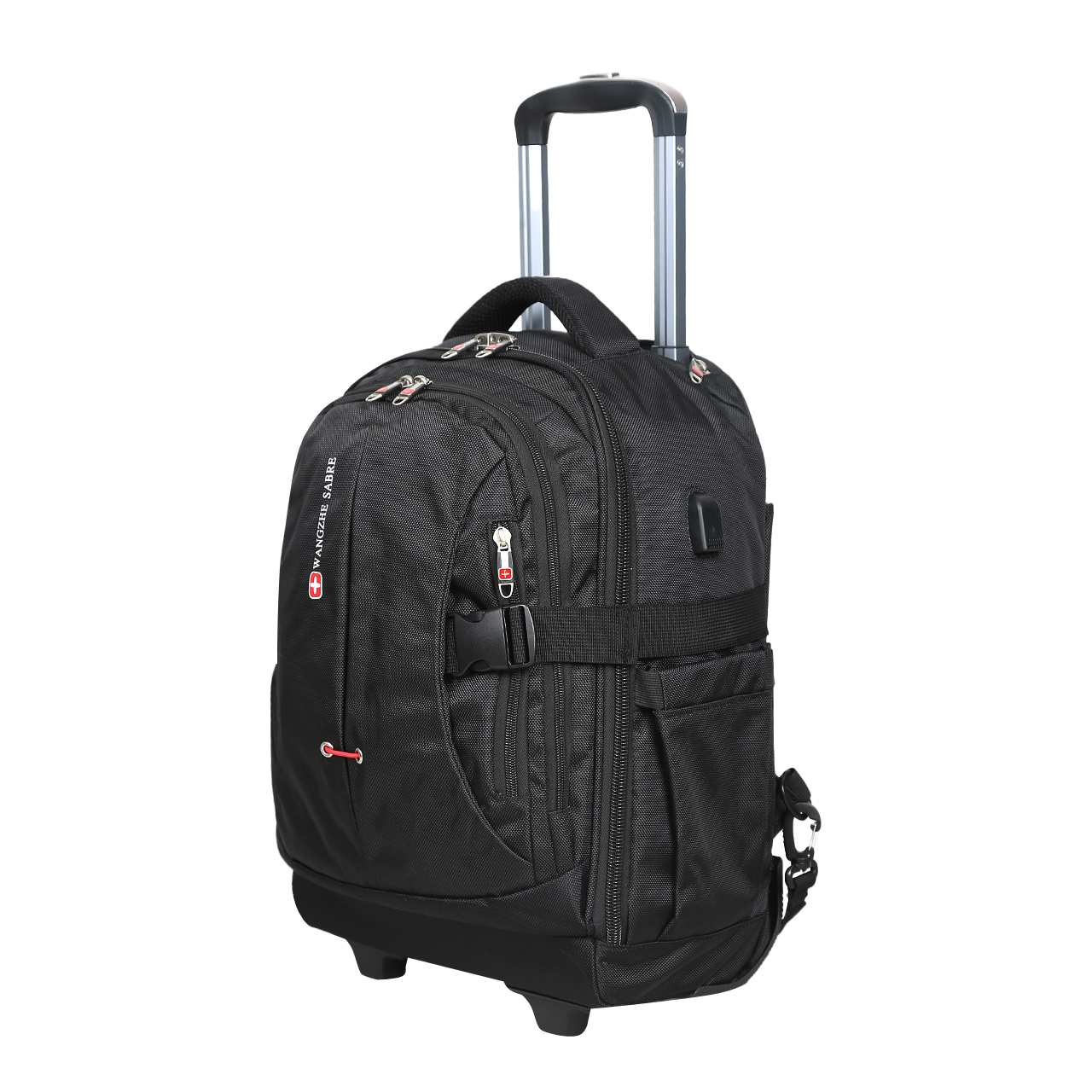 مجموعه دو عددی کوله پشتی چرخدار سوییس گیر SWISS GEAR مدل SBS8090 سایز 22 اینچ و سایز 18 اینچ دارای رنگ مشکی از جنس رویه پارچه جودون ریز بافت با تراکم بالا و آستر داخلی پلی استر تشکیل شده است. چرخ این محصول به صورت دو چرخ می باشد که چرخ ها با پرچ نصب شده است و بسیار مقاوم و محکم می باشد. دسته ترولی این محصول از جنس آلیاژ آلومینیوم هست که مدل دسته چمدان می باشد و قابل تنظیم در ارتفاع های مختلف می باشد که با طراحی بسیار زیبای آن، این نوع دسته از دسته های تک متمایز شده است و در صورت عدم استفاده دسته ترولی می توانید زیپ بالای دسته را ببندید و دیگر دسته ترولی مشخص نمی باشد.دسته ثابت بالای آن بسیار راحت می باشد.بند کوله این محصول دارای فیکسر سینه که قابل تنظیم می باشد و در زمان عدم استفاده بند، می توانید سگگ های کوله را باز نموده و در قسمت فضای پارچه ای پشت کوله قرار دهید که مشخص نباشد.