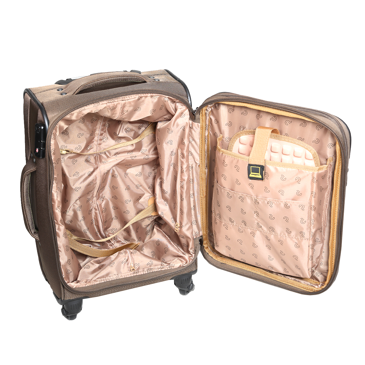 چمدان پیر کاردین PIERR CARDIN مدل SBP3600 سایز کوچک 20 اینچ، دارای پنج رنگ مشکی، سرمه ای، زیتونی (قهوه ای)، آبی دودی، بنفش می باشد. این محصول ساخته شده از جنس رویه پلی استر آغشته به مواد پی وی سی با تراکم بافت بالا (پارچه جودون) که کاملا ضد آب می باشد و آستر داخلی با طرح پیرکاردین از جنس پلی استر که با مواد اولیه درجه یک تولید شده است. دسته ترولی این محصول با طراحی بسیار خاص و متفاوت آن از جنس آلیاژ مرغوب آلومینیوم ساخته شده است که مناسب حمل چمدان با وزن های استاندارد هر سایز می باشد که نگرانی مصرف کننده کامل رفع گردیده است و برای راحتی در حمل، قابل تنظیم در ارتفاع های مختلف می باشد. چرخ های این محصول از جنس مواد با کیفیت PU و پلاستیک بوده که فوق العاده روان و با کیفیت هستند و به صورت چهار چرخ گردان 360 می باشد. این محصول به همراه کاور می باشد.