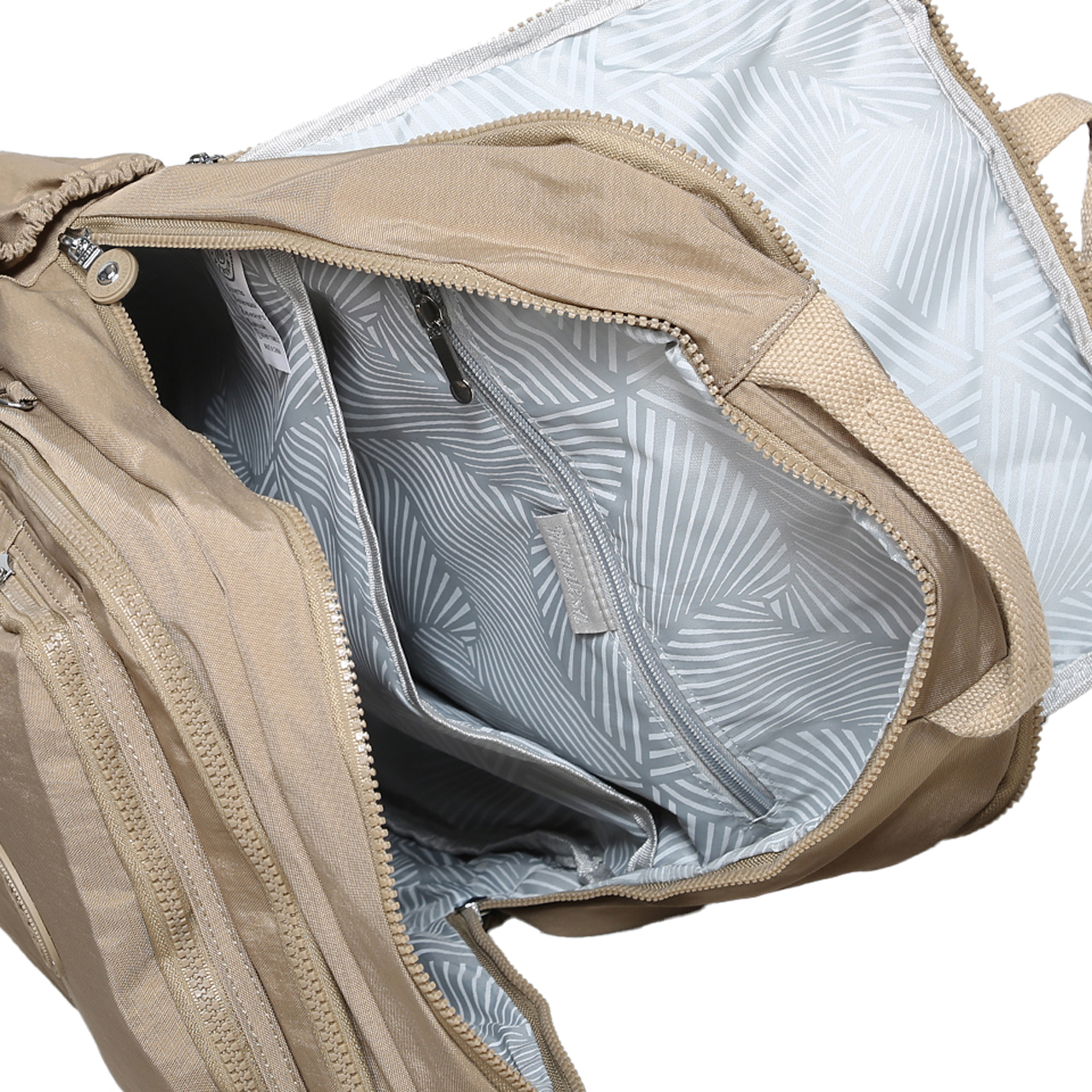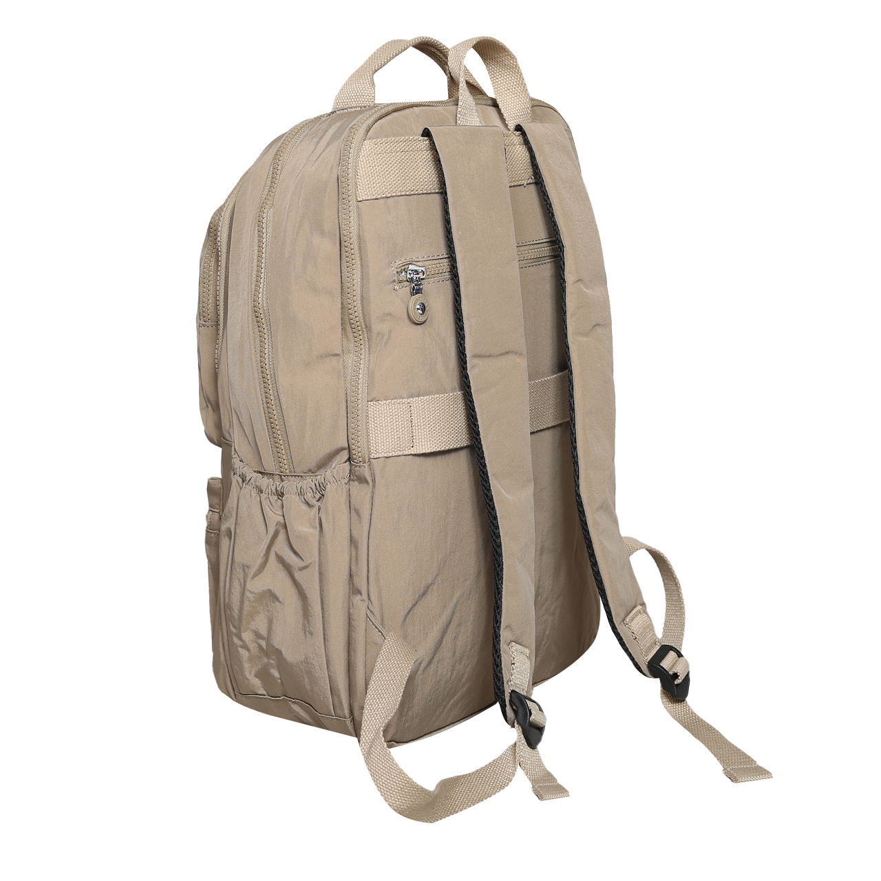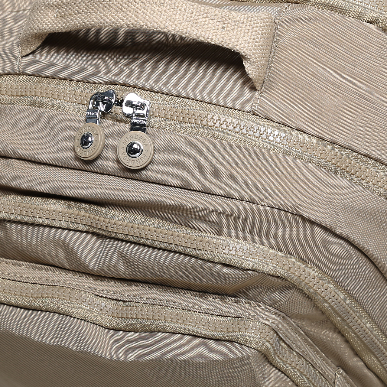 کوله پشتی میندسا MINDESA مدل SBM8766 یک کوله بسیار شیک و خاص از برند میندسا ساخته شده از پارچه واتر ریز بافت (جودون) و آستر داخلی پلی استر و در رنگ بندی بسیار زیبا کوله ای بسیار خوش سایز هست که از این محصول بسیار کابردی هم می توان به عنوان کوله ای برای استفاده روزمره و مدرسه و دانشگاه یا در سفر از آن استفاده نمود. از طراحی بسیار زیبای این محصول که بگذریم، این محصول دارای چندین فضای بسیار عالی و کاربردی هست، که زمانی که فضای زیپ دار اصلی باز شود یک فضای زیپ دار و یک فضای لپ تاپ یا تبلت (فضای جای لپ تاپ 27*36 سانتی متر) در قسمت دیواره وجود دارد و در پشت زیپ اصلی یک فضای زیپ دار جهت ساماندهی مدارک و تفکیک وسایل خود وجود دارد. در قسمت جلوی کوله پشتی میندسا چندین فضای زیپ دار و جیب های تعبیه شده است که مناسب و ایده آل برای گذاشتن لوازم خرده ریز شما می باشد. در قسمت پشت محصول یک جیب زیپ دار و یک تسمه برای قرار دادن کوله بر روی دسته چمدان در سفر وجود دارد. در قسمت های کنار کوله در هر سمت دارای یک جیب می باشد که بسیار کاربردی می باشد. این محصول دارای یک عدد دسته ثابت در قسمت بالای کوله می باشد. زیپ های اصلی این محصول بسیار با کیفیت کار شده است و سر زیپ های خاص آن به زیبایی کار افزوده است. وزن این محصول بسیار سبک و 650 گرم می باشد.