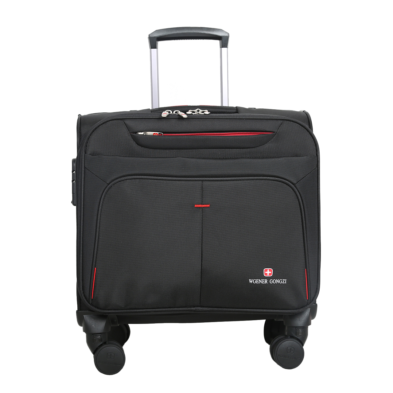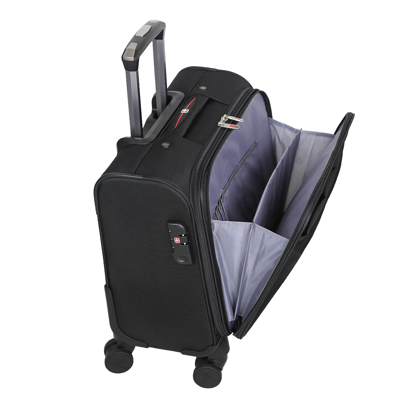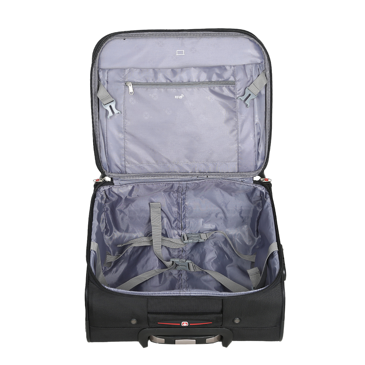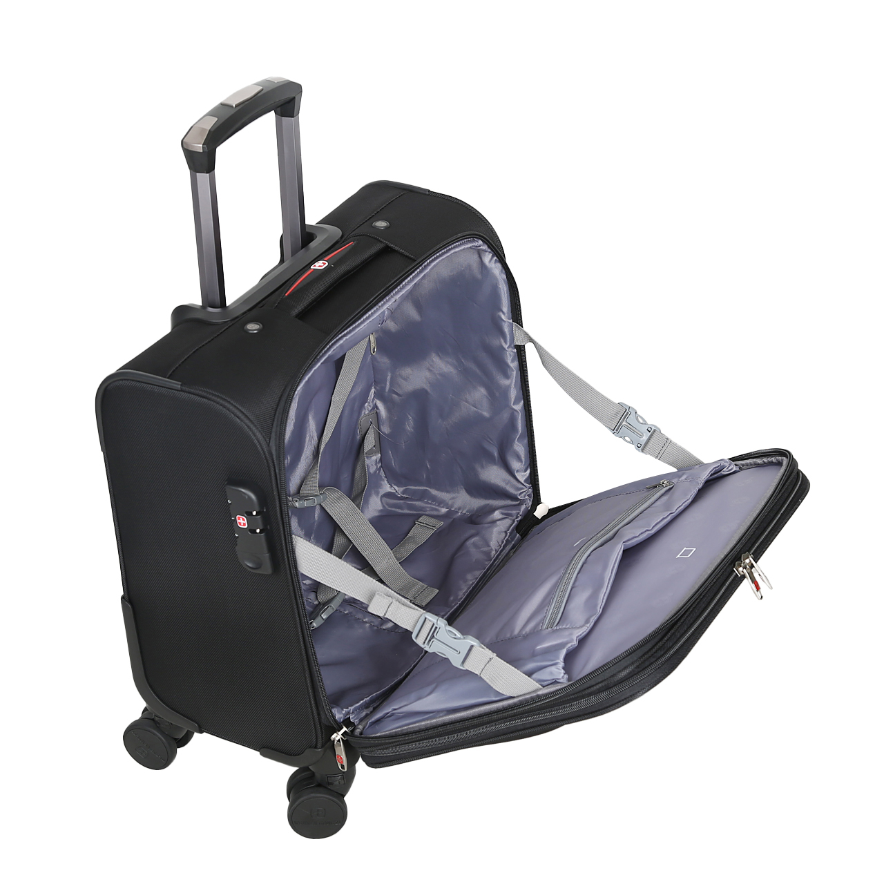 کیف خلبانی سوییس گیر SWISS GEAR مدل SBS5004 دارای رنگ مشکی می باشد. جنس این محصول از پارچه جودون با تراکم بافت بالا، بسیار مقاوم و محکم می باشد. دسته ترولی این محصول چهار استپ با طراحی بسیار مناسب از جنس آلیاژ مرغوب آلومینیوم ساخته شده است که بسیار مقاوم می باشد. چرخ های این محصول از جنس مواد پلاستیک و PU بوده که فوق العاده روان هستند و به صورت چهار چرخ دبل جداشو گردان 360 می باشد. زیپ اصلی این محصول نمره هشت دوبل می باشد و دارای قفل رمزی می باشد. طراحی داخلی این محصول بسیار شیک از آستر پلی استر با طرح برند محصول می باشد و در قسمت درب آن یک فضای جای لپ تاپ و جیب زیپ دار وجود دارد. در قسمت جلوی کیف خلبانی سوییس گیر یک فضای زیپ دار وجود دارد که داخل آن یک پارتیشن و در دیواره جای لوازم خرده ریز دارد که به راحتی می توانید لوازم خود را به صورت تفکیکی بگذارید و جیب های جلو این امکان را می دهد که لوازم خرده ریز به راحتی در دسترس شما باشد. در قسمت پشت این محصول جای اسم وجود دارد. دسته بالای این محصول بسیار راحت و محکم و مقاوم می باشد. این محصول مناسب برای سفرهای اداری و کوتاه و بهترین گزینه برای داخل کابین هواپیما می باشد.