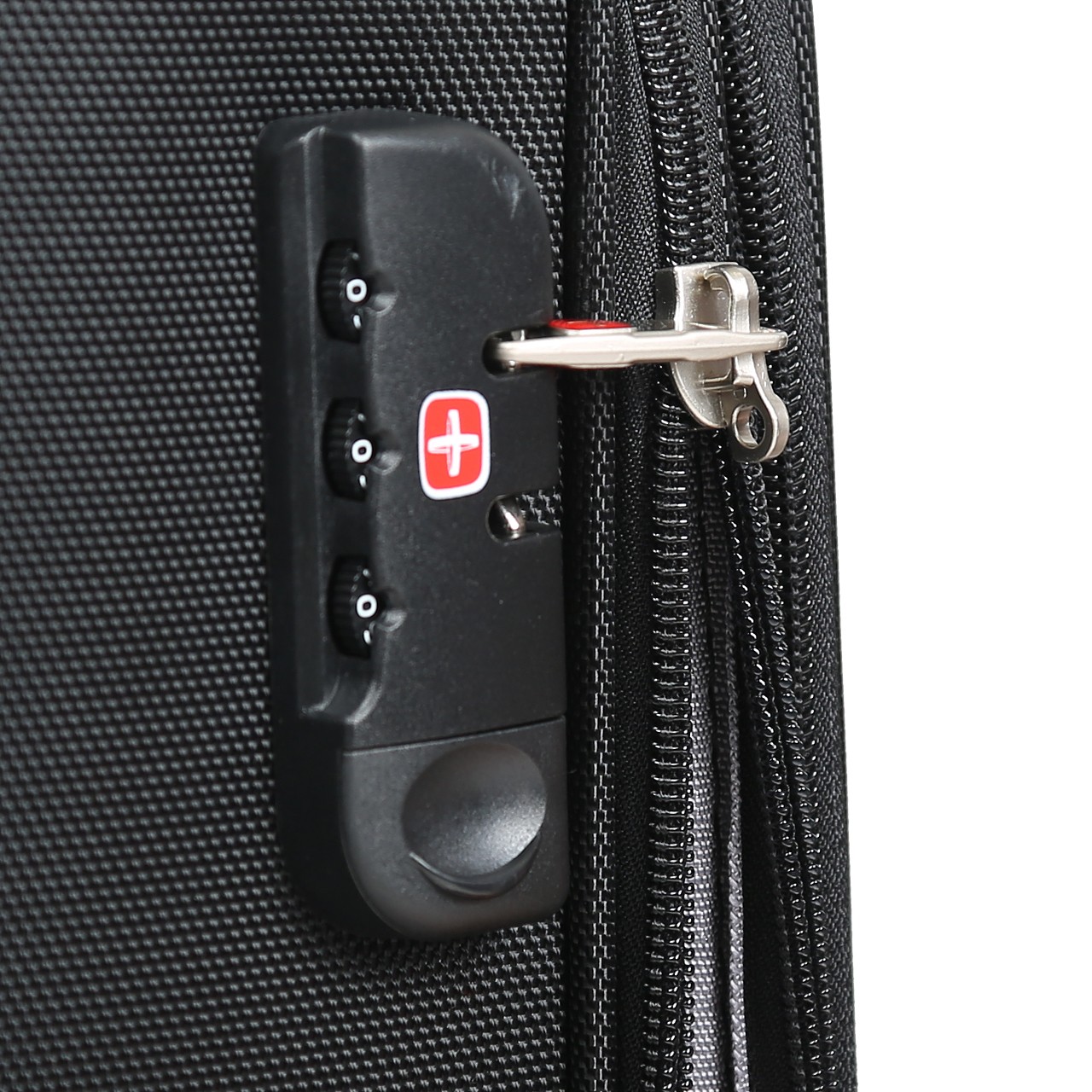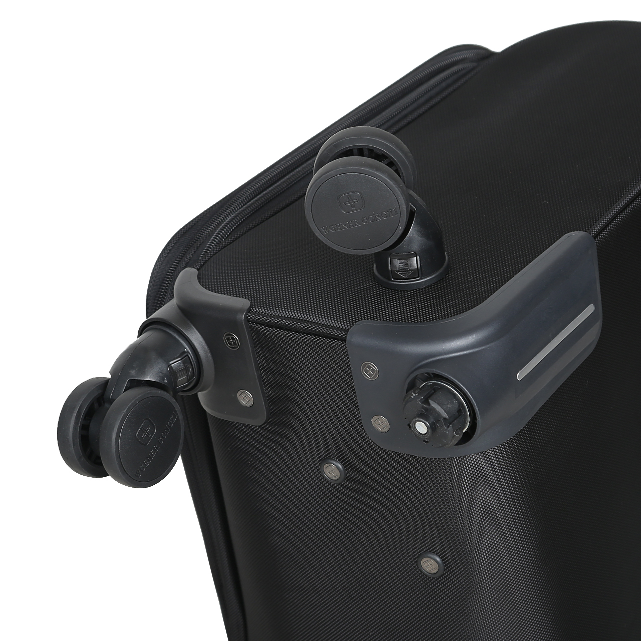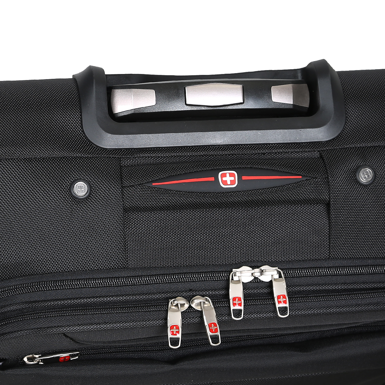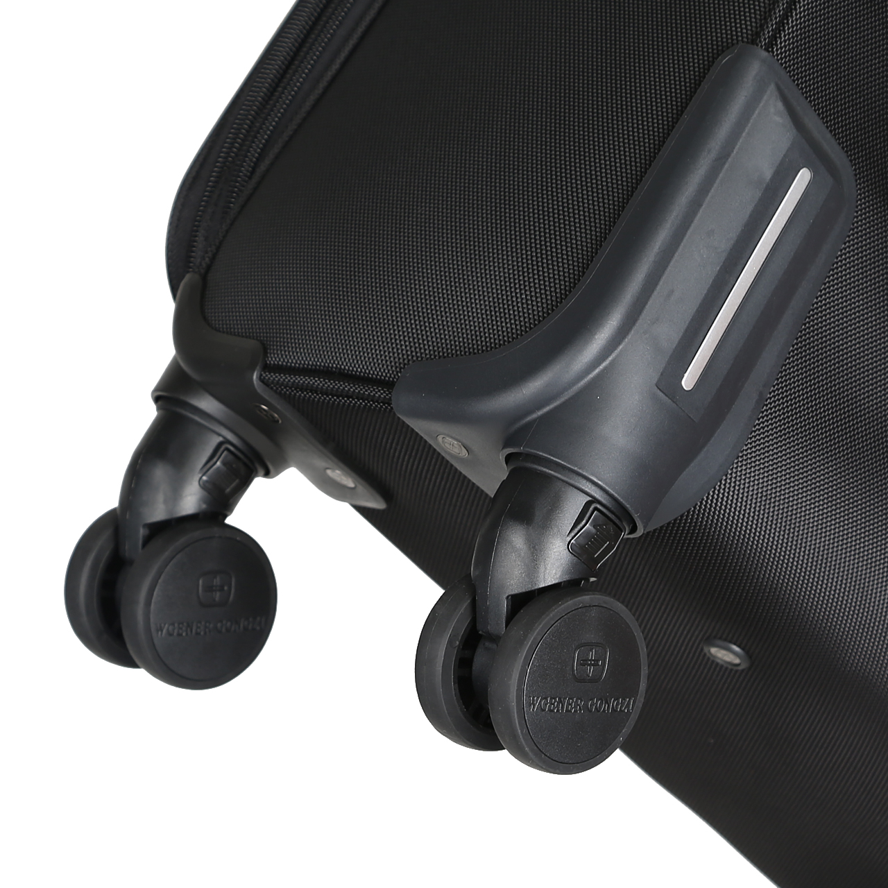 کیف خلبانی سوییس گیر SWISS GEAR مدل SBS5004 دارای رنگ مشکی می باشد. جنس این محصول از پارچه جودون با تراکم بافت بالا، بسیار مقاوم و محکم می باشد. دسته ترولی این محصول چهار استپ با طراحی بسیار مناسب از جنس آلیاژ مرغوب آلومینیوم ساخته شده است که بسیار مقاوم می باشد. چرخ های این محصول از جنس مواد پلاستیک و PU بوده که فوق العاده روان هستند و به صورت چهار چرخ دبل جداشو گردان 360 می باشد.