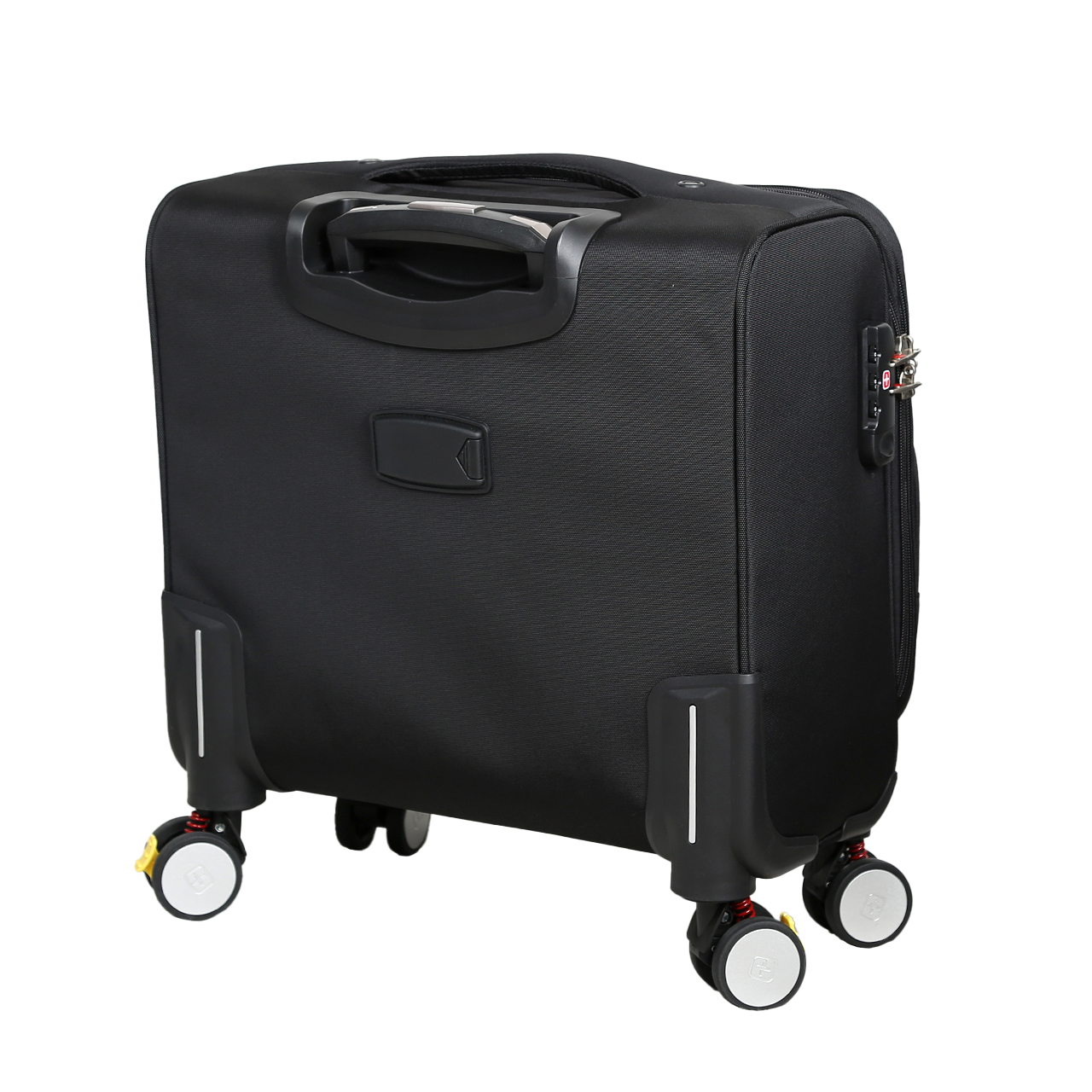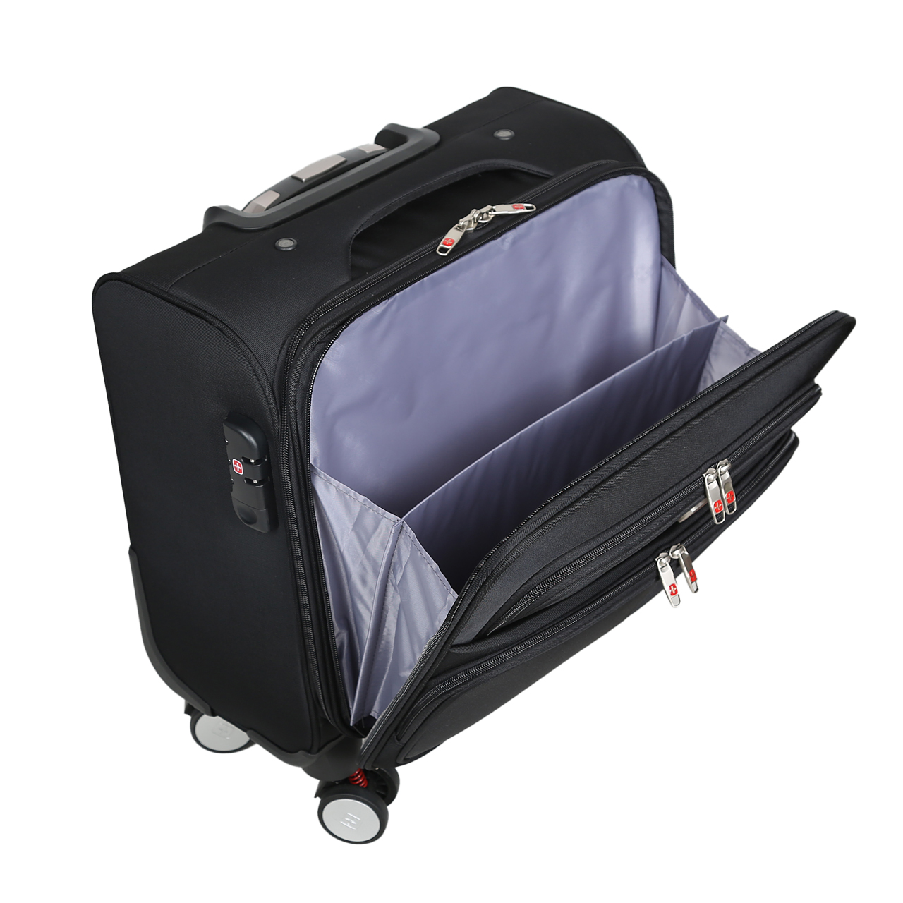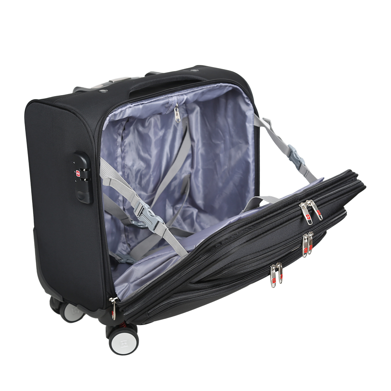 کیف خلبانی سوییس گیر SWISS GEAR مدل SBS5018 دارای رنگ مشکی می باشد. جنس این محصول از پارچه جودون ریز بافت با تراکم بافت بالا، بسیار مقاوم و محکم می باشد. دسته ترولی این محصول چهار استپ با طراحی بسیار مناسب از جنس آلیاژ مرغوب آلومینیوم ساخته شده است که بسیار مقاوم می باشد. چرخ های این محصول از جنس مواد پلاستیک و PU بوده که فوق العاده روان هستند و به صورت چهار چرخ دبل گردان 360 و فنردار و ترمز چرخ های عقب می باشد. زیپ اصلی این محصول نمره هشت دوبل می باشد و دارای قفل رمزی می باشد. طراحی داخلی این محصول بسیار شیک از آستر پلی استر با طرح برند محصول می باشد و در قسمت درب آن یک فضای جای لپ تاپ وجود دارد. در قسمت جلوی کیف خلبانی سوییس گیر یک فضای زیپ دار وجود دارد که داخل آن یک پارتیشن که به راحتی می توانید لوازم خود را به صورت تفکیکی بگذارید و جیب های جلو این امکان را می دهد که لوازم خرده ریز به راحتی در دسترس شما باشد. در قسمت پشت این محصول جای اسم وجود دارد. دسته بالای این محصول بسیار راحت و محکم و مقاوم می باشد. این محصول مناسب برای سفرهای اداری و کوتاه و بهترین گزینه برای داخل کابین هواپیما می باشد.